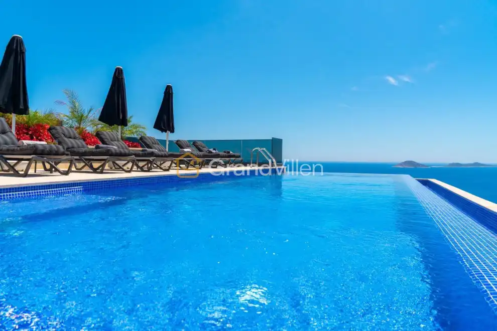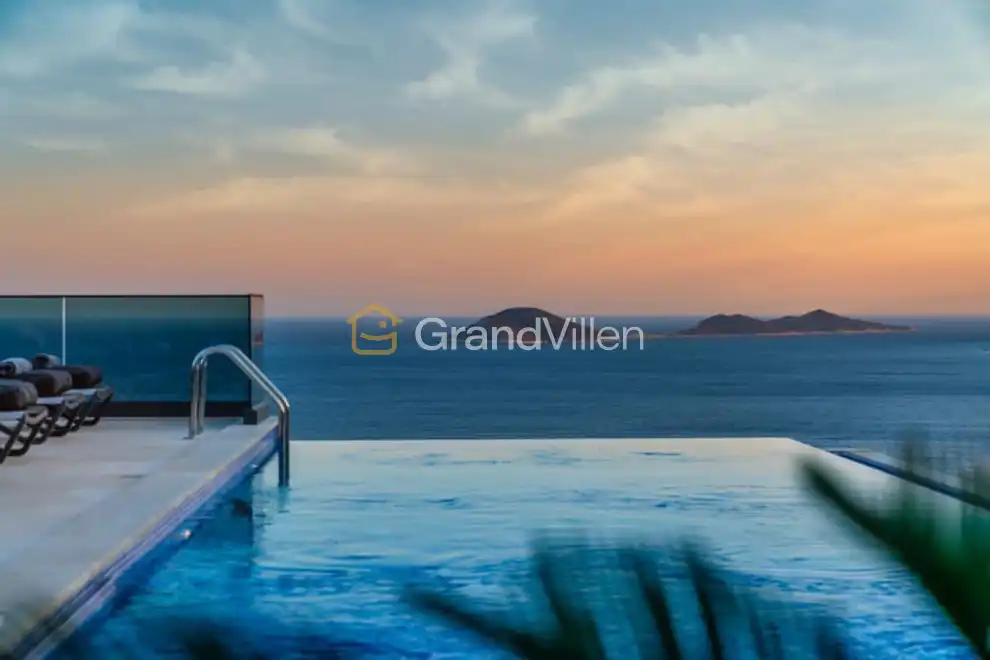 Villa Ayse is a luxurious villa with a magnificent sea view overlooking Kalamar Bay in Kalkan, offering 6 bedrooms and a capacity for 12 people. In addition to its stunning and comfortable design, Villa Ayse is ready to offer you incredible views with its swimming pools (one large pool on the first floor and one small children's pool in the garden on the ground floor) and garden area. Every detail has been carefully considered, allowing you to simply enjoy your holiday. Villa Ayse is also conveniently located within walking distance of Kalkan center, many beaches, and restaurants. With its luxurious decor, Villa Ayse stands out as a perfect choice for large families or groups of friends. Pets are not allowed, and smoking is prohibited inside the villa. The villa is equipped with underfloor heating and also offers a heated pool during the winter months, making it ideal for both summer and winter stays.